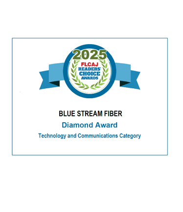 March 3, 2025 – Coral Springs, FL – Blue Stream Fiber is honored to announce that it has been awarded the prestigious Diamond Award in the Technology and Communications category at the 2025 Florida Community Association Journal (FLCAJ) Readers’ Choice Awards for the third consecutive year. This recognition highlights Blue Stream Fiber’s ongoing commitment to delivering best-in-class telecommunications services to communities across Florida.
